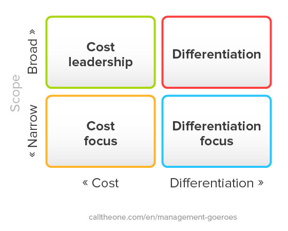 According to Michael Porter you can choose from a large market (where you will most likely have a lot of competition) and a niche market where you will probably have less competition. In addition, you can choose to go for a low price in the large or niche market (cost focus and cost leadership). In both cases, the entire strategy must be aimed at operating as cheaply as possible.